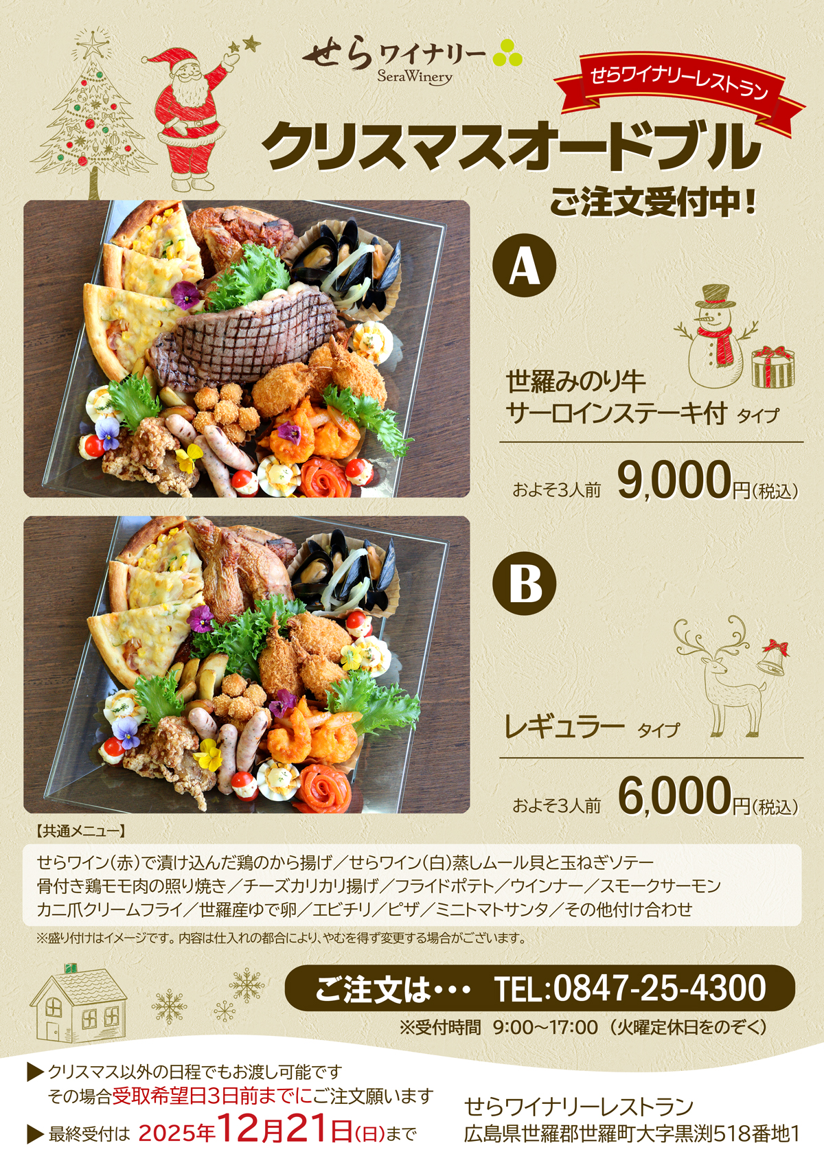 【サービス情報】せらワイナリーレストラン「クリスマスオードブル」ご注文承り中!(最終受付日:12月21日)