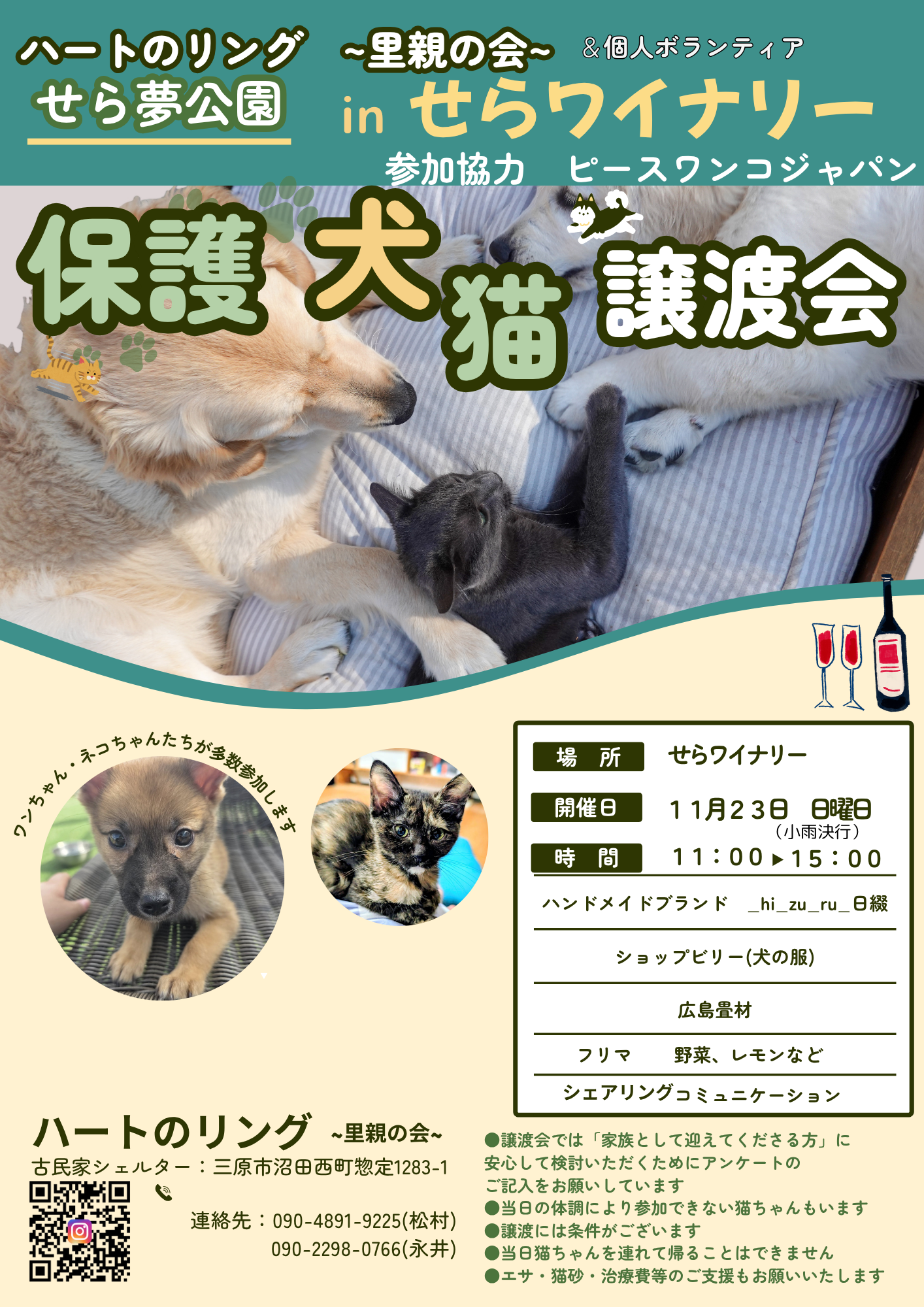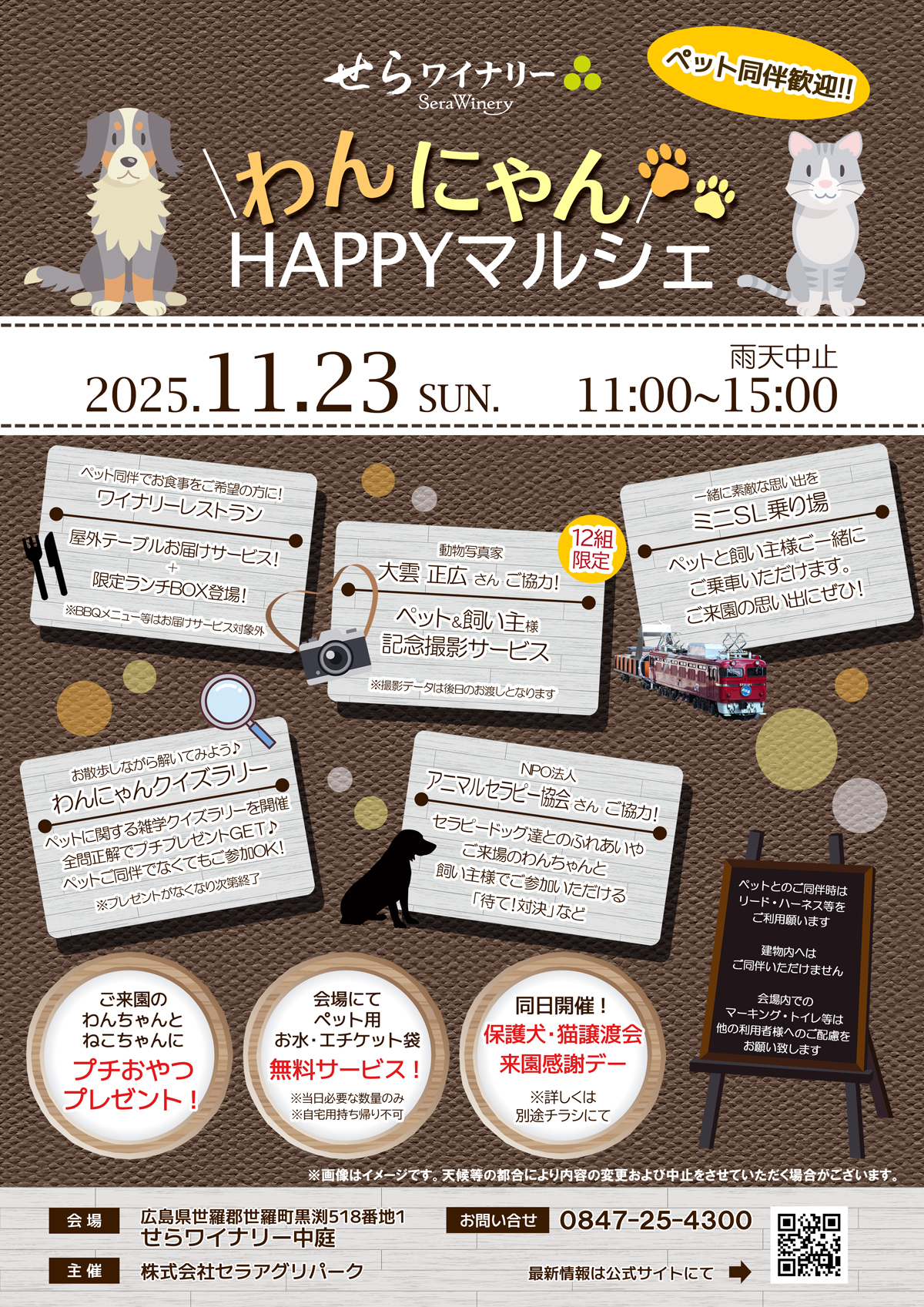 【イベント情報】2025年11月23日(日)開催「わんにゃんHAPPYマルシェ」<主催:(株)セラアグリパーク>、「保護犬・猫譲渡会」<主催:ハートのリング~里親の会~様 /個人ボランティア様>