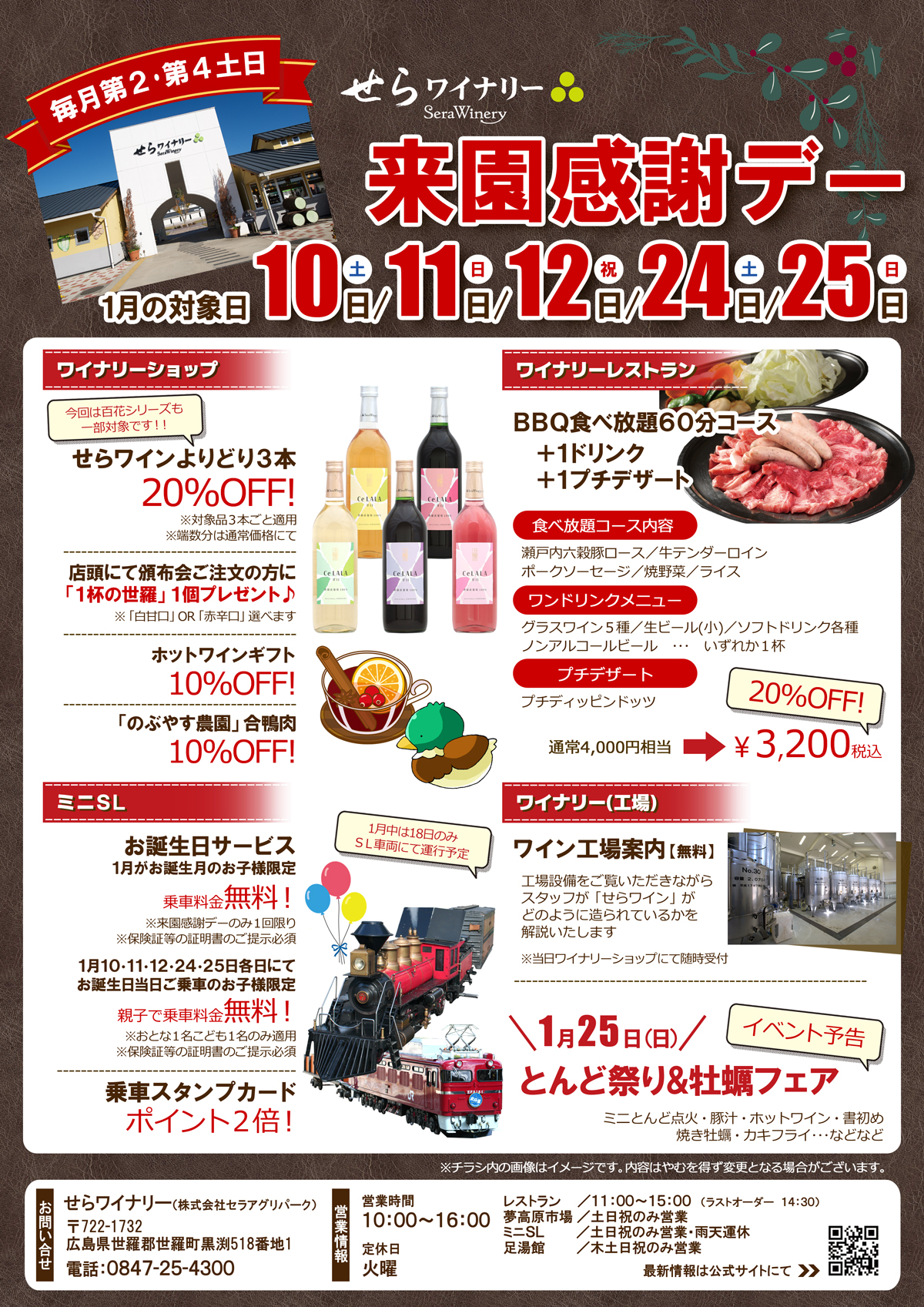 【サービス情報】1月の来園感謝デーは1月10日(土)・11日(日)・12日(月/祝)・24日(土)・25日(日)です。ご来園お待ちしております♪